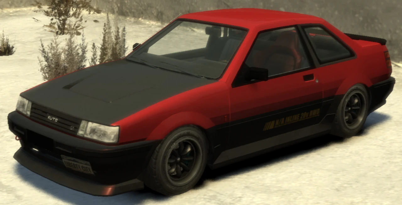 The modified variant of the Futo called 'Futo GT' is based on Toyota AE86 Levin GT-S and Nissan Skyline DR30 RS-Turbo. It can be commonly found in Little Bay and is also rarely found in other areas of Bohan. It's name comes from the 'GT' badge on the front grill, but the game still refers to the car simply as 'Futo' when entered. Its performance is identical to the stock car's, cause it shares the same handing lines and uses the same car model, albeit using other car components to get the different look. It's modifications feature a small body kit, a rear boot lip spoiler, a carbon-fiber hood, a roll cage, a strut bar mounted over the engine, a racing seat on the driver's side, an upgraded tachometer, and an additional 'Inline 20v' badge under the right side rear light. The car also includes a larger, blue titanium exhaust tip, an offset driver's side front license plate and finally a red tow clip, similar to those used on track cars on the passenger side of the front bumper. It always spawns in red and black, but can be resprayed any color.