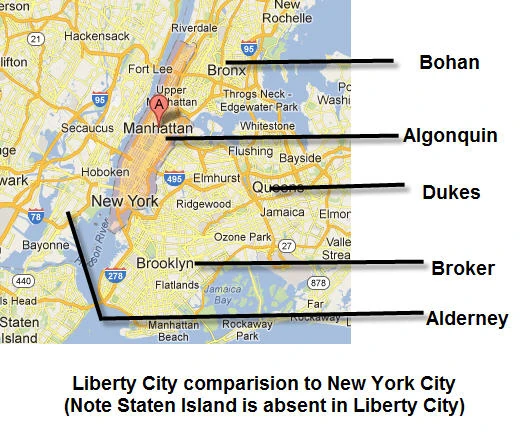 This rendition of Liberty City has versions of four of the five boroughs of New York City, plus New Jersey. Brooklyn is Broker, Queens is Dukes, Manhattan is Algonquin, and Bronx is Bohan. The state and city of New Jersey is Alderney, which technically is separate from Liberty City. The only borough not to be recreated in the game is Staten Island. Although in the game, Liberty City appears to be an isolated set of islands, the rest of America is actually nearby. Rockstar Games stated that they avoided placing unreachable pieces of land in the distance to retain the city's "complete" feel.